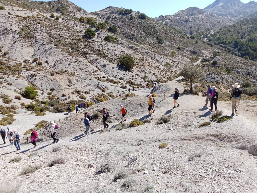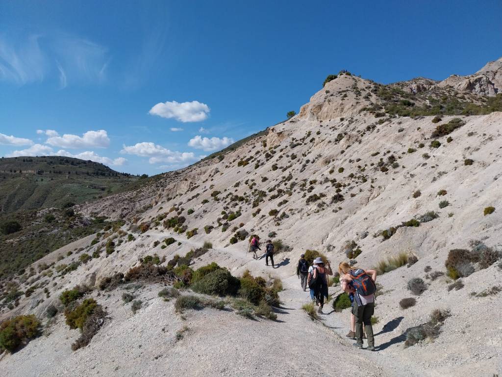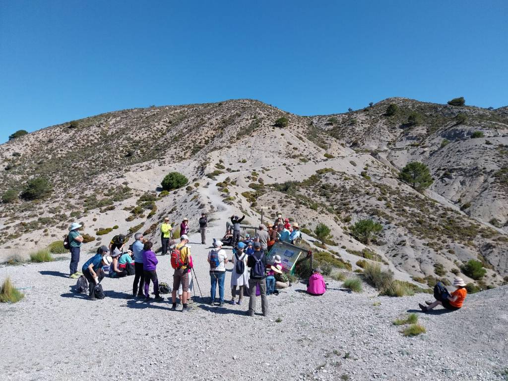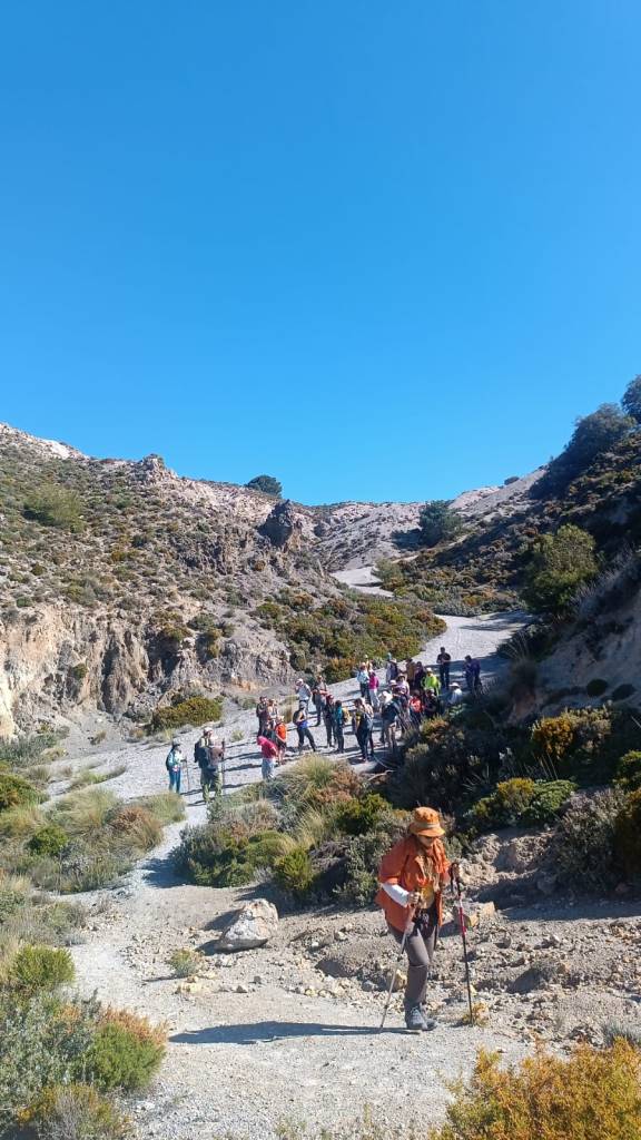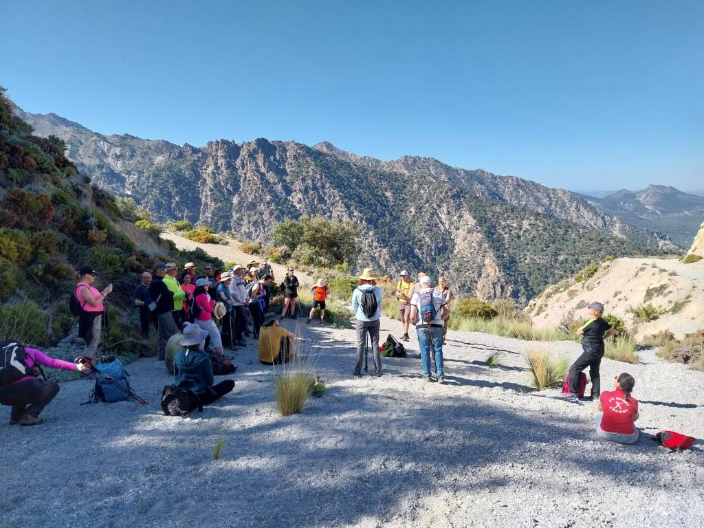 Durante el recorrido por los arenales intentamos desvelar no solo los valores botánicos de esta zona, sino también repasamos la historia natural. Y es que, como se suele decir, hay que conocer nuestro pasado para comprender nuestro presente. En resumen, la flora de esta sierra es excepcional pues su situación geográfica ha hecho que a lo largo de una trepidante historia llegaran muchas plantas “migrantes” y este lugar, con su gran diversidad de altitudinal, su riqueza geológica y otros factores, ha sido tierra de acogida. Esta sierra ha ofrecido siempre al menos un pequeño espacio donde una gran diversidad de plantas que han llegado desde lugares tan dispares como África o el Ártico han encontrado un hogar. Ese es el secreto de nuestra gran montaña y de su excelsa biodiversidad. Eso si, algunas de esas plantas son pequeñas, pues tienen una vida dura y difícil derivada de un medio hostil y complejo como es la dolomía de media-alta montaña que representa la zona que recorrimos. Y menos mal que era principios de primavera, porque en el primer tramo de la jornada, por los arenales del Trevenque, nuestros participantes pudieron sentir el rigor del lugar, ¡Imaginad lo que es pasar aquí todo el verano sin patitas con las que salir corriendo!