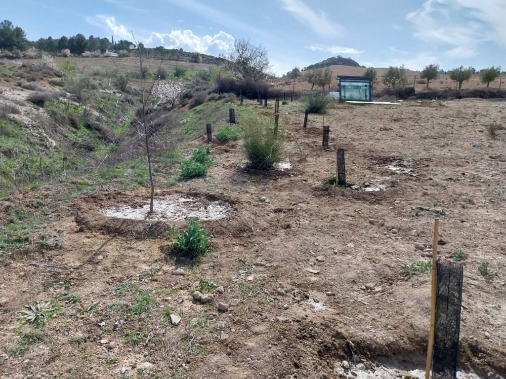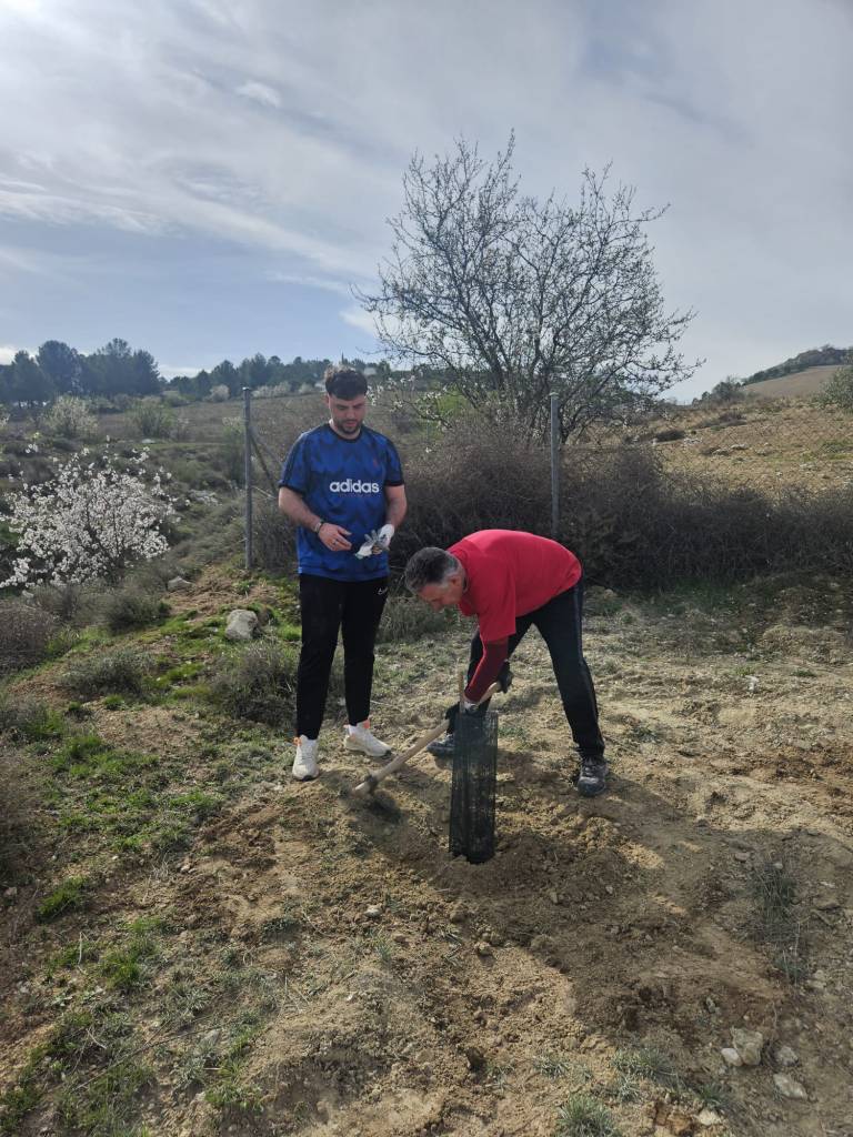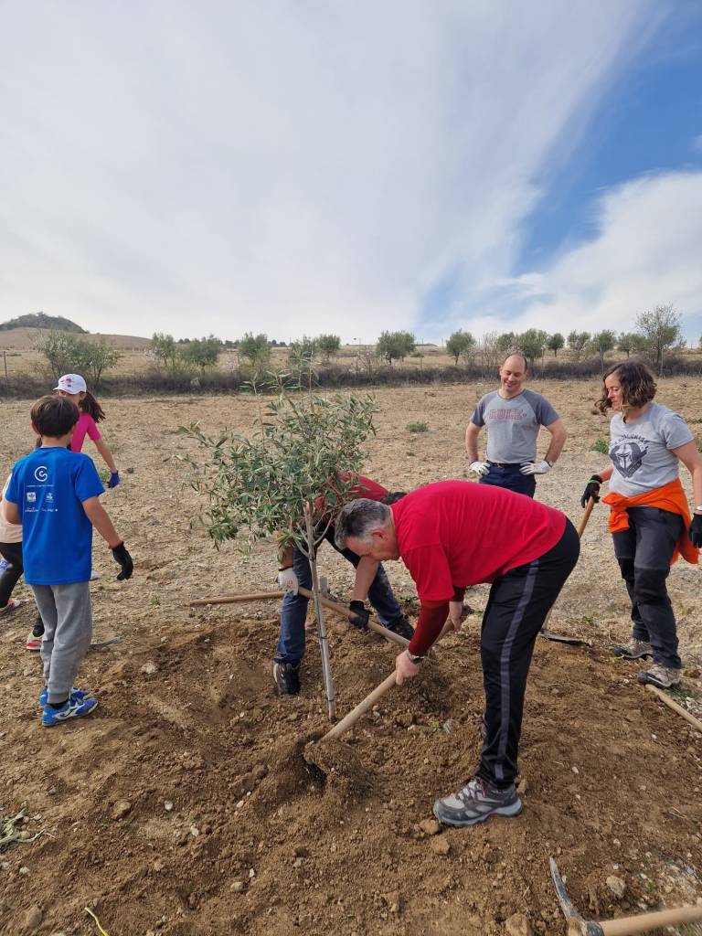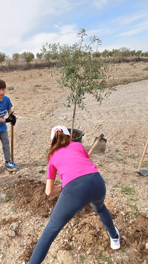 - Cerca de la “plaza”, espacio que quiere ser el espacio central del uso “humano” del espacio plantamos un ejemplar de olivo, un homenaje a Andalucía en su día, y es que este posiblemente el árbol que mejor simboliza nuestra cultura. También plantamos una sabina, otra planta autóctona pero poco común en nuestra tierra (revindicamos que queremos que este bosque refleje la diversidad de nuestro territorio).