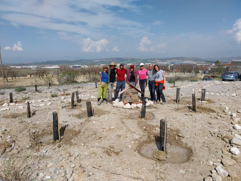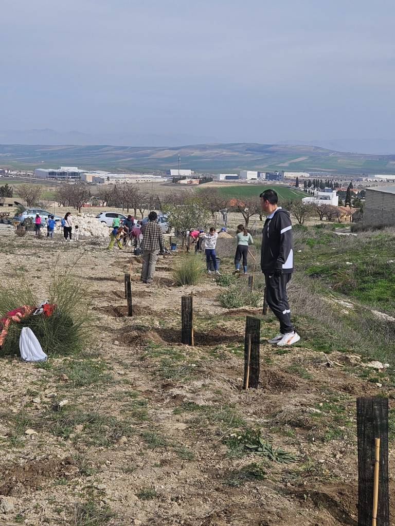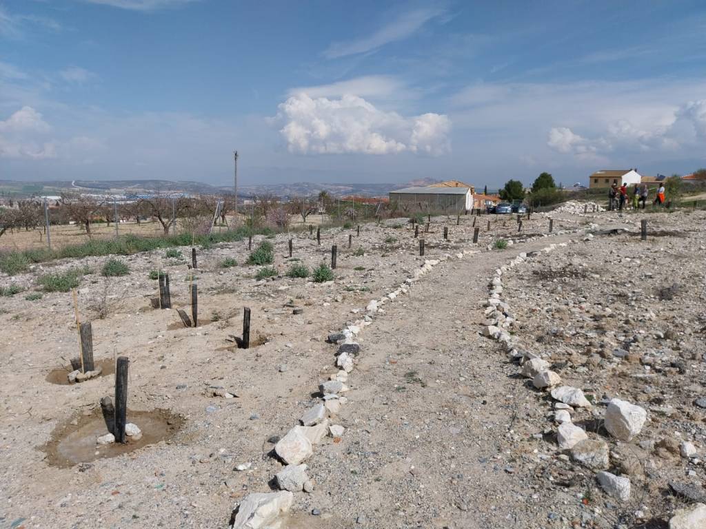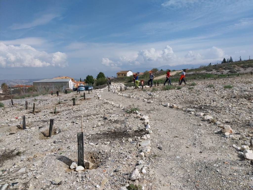 Una vez aclarado esto, diremos que esta antigua escombrera esta en Escúzar, y que como se quiere crear un bosque con todo ese pueblo este proyecto se llama Bosque Pueblo. Esta iniciativa empezó hace unos meses y el pasado 28 de febrero, día de Andalucía, logro dar un paso significativo. Nos juntamos unas 34 personas del pueblo junto con otras 9 personas “forasteras” que vinieron a través del programa ECO DÍAS, personas voluntarias que por unas horas fueron unos habitantes más de Escúzar.